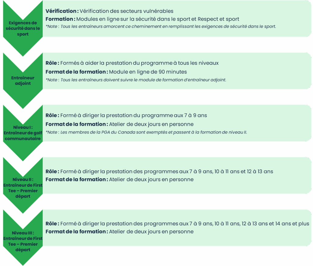 La formation des entraîneurs de First Tee – Premier départ est offerte aux futurs entraîneurs du Canada conjointement par First Tee – Premier départ et la PGA du Canada. Ce partenariat collaboratif permet aux entraîneurs qui participent au programme First Tee – Premier départ pour les entraîneurs de choisir leur propre niveau d’implication.